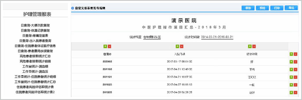 系統(tǒng)內(nèi)置具有高度可配置性的自定義報表功能,不僅支持查詢分析類報表更加可以實現(xiàn)基于報表的二次錄入和實時編輯,充分滿足護理統(tǒng)計預(yù)分析的個性化需求