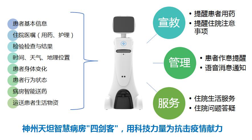 神州天坦智慧病房"四劍客",是神舟天坦憑借著十余年在醫(yī)療衛(wèi)生領(lǐng)域中豐富的行業(yè)經(jīng)驗積累,并針對此次新冠疫情防治的一線醫(yī)護人員日常工作需求,優(yōu)選出的可以快速搭建、臨床實用性高的智慧病房四大子系統(tǒng),具有很強的建設(shè)價值。以軟硬件、物聯(lián)網(wǎng)和人工智能技術(shù),構(gòu)筑起防治新型冠狀病毒的信息化關(guān)口,為醫(yī)護人員診療工作、患者住院服務(wù)進行保駕護航。以科技的力量為抗擊疫情獻力,我們一起攜手同行、共克時艱。贏得這場沒有硝煙的戰(zhàn)“疫”,中國加油!戰(zhàn)“疫”必勝!