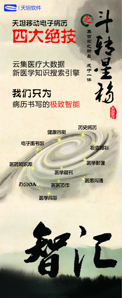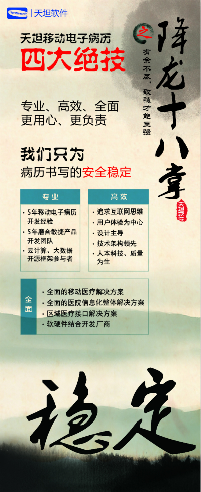 天坦軟件,作為國內移動電子病歷的先行者,盛裝亮相京交會。在會上展示了以“天坦移動電子病歷”為核心的醫(yī)院整體信息化系統(tǒng),受到眾多參觀者的關注。天坦軟件始終堅持以“讓天下沒有難看的病”為宗旨,致力于醫(yī)療事業(yè)發(fā)展。為中國醫(yī)療衛(wèi)生行業(yè)的信息化建設以及個人健康服務提供從硬件到軟件、從技術到服務的全面解決方案,是中國醫(yī)療信息化市場中快速成長的獨立軟件廠商之一。數(shù)年來,一直堅持研發(fā)以移動電子病歷為核心的醫(yī)院信息化系統(tǒng),從移動框架的病歷編輯器到跨平臺的移動醫(yī)療解決方案,為整個病歷信息化行業(yè)注入了極強的創(chuàng)新活力。 “天坦移動電子病歷”為核心的醫(yī)院整體信息化系統(tǒng)秉承“高效應用、信息互通”的基本理念,是專門為醫(yī)院設計開發(fā)的醫(yī)療信息化系統(tǒng)的核心組成部分。具有高效、安全、穩(wěn)定、易用、移動、智能等特點,除此之外,還具有穩(wěn)定、完全跨平臺運行、功能強大、系統(tǒng)性能卓越等巨大優(yōu)勢。