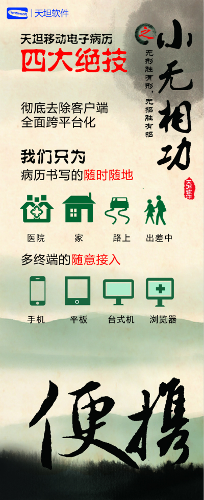 在全球范圍,向移動互聯(lián)網(wǎng)推進的浪潮已經勢不可擋, 醫(yī)療行業(yè)如其他行業(yè)一樣,要想更好地發(fā)展,必須融入這個浪潮。天坦軟件通過多年的努力,打造出“天坦移動電子病歷”,加強了醫(yī)院管理效率和力度,避免醫(yī)療差錯和事故,改善醫(yī)患關系,減少醫(yī)患矛盾,提高醫(yī)護人員的工作效率,提高醫(yī)療服務響應能力,隨時隨地為患者服務。